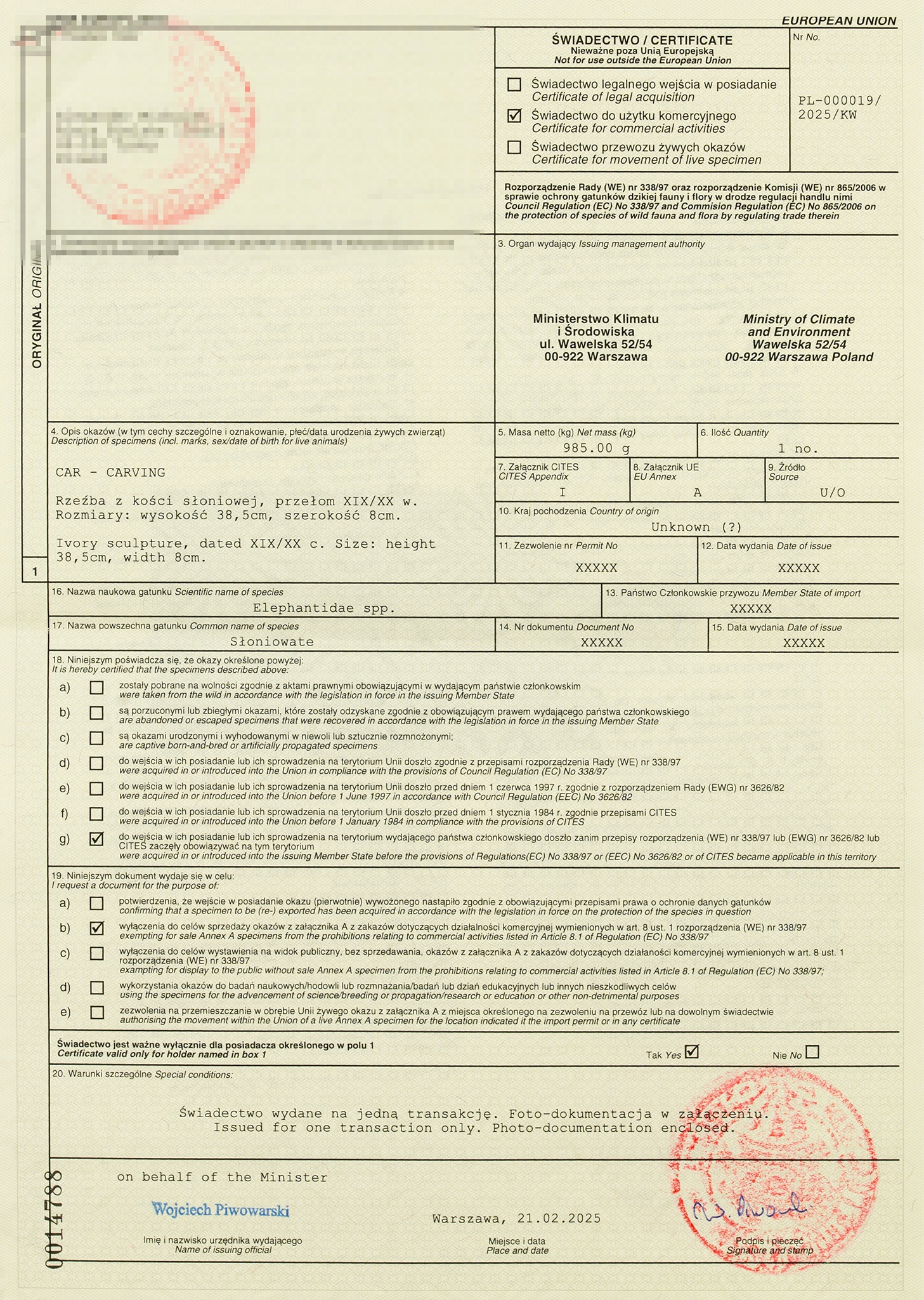 к объекту прилагается текущий сертификат CITES, выпущенный Министерством окружающей среды и климата BRED в настоящее время единственный официальный документ, позволяющий предлагать коммерческий рынок в Европейском союзе. ✽18 Ответственность за продукт ✽19 Безопасность, соблюдение и предупреждения